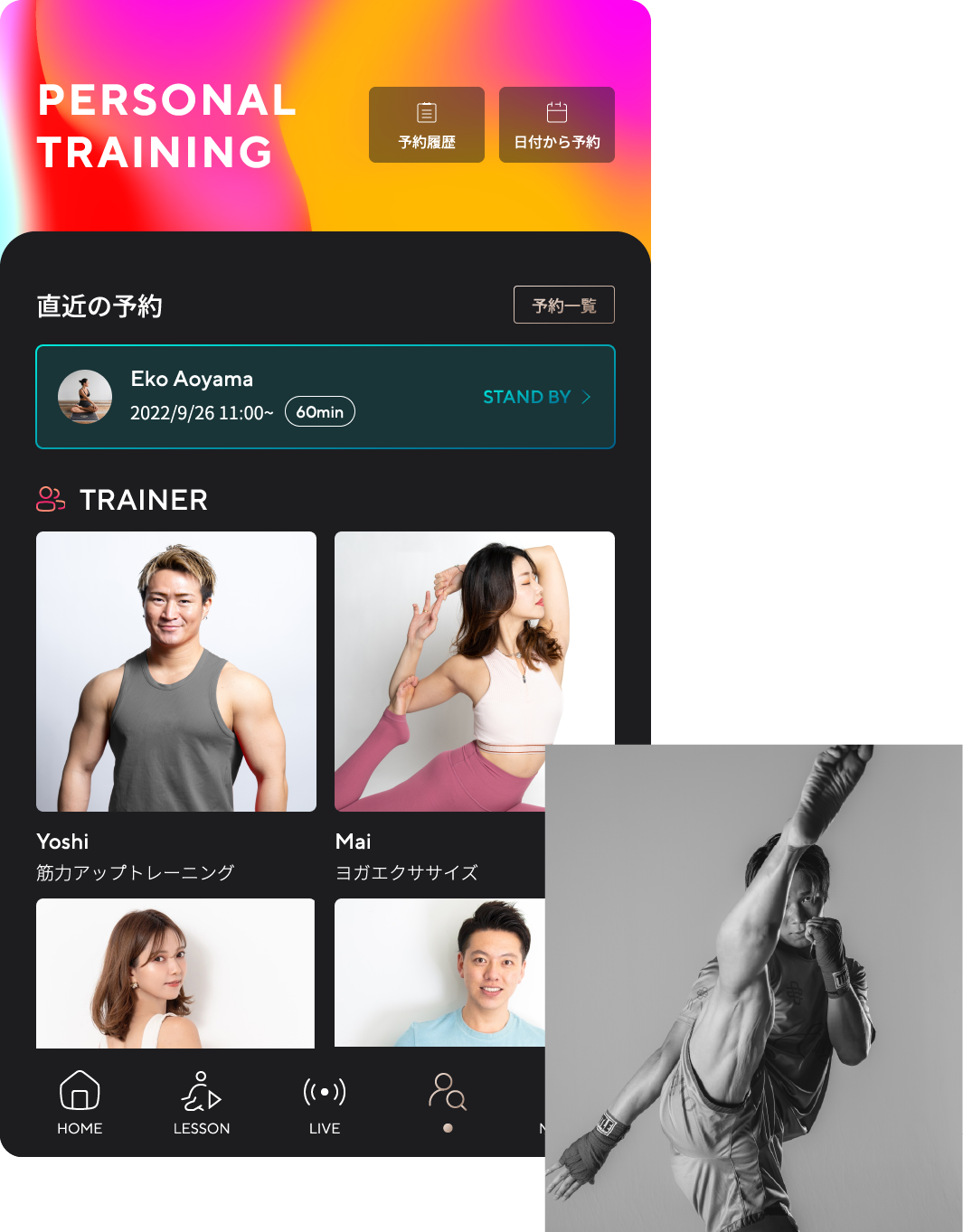 人気トレーナーによるライブレッスンやパーソナルトレーニング、400種類以上のビデオオンデマンドクラスなど豊富なコンテンツが揃います。